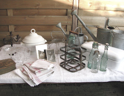 Og hva har jeg brukt tiden på den sisten tiden? Det er vel ingen hemmelighet at jeg gjerne bruker fritid og helger på markeder, bruktforhandlere og loppis, og det er akkurat det jeg har gjort den siste tiden. Under har jeg samlet mesteparten for å gi et lite inntrykk av hva jeg har vært så heldig å finne. Bordet var faktisk ikke stort nok, for i tillegg til alt dette har jeg kjøpt en haug med gamle laken, kurver, gamle spruteflasker og keramikk. Og til sist har jeg lagt inn et bud på en Antikk Fransk seng. Dere vet, en sånn fin vakker gammel jernseng. Den er bare såååå fin! Håper den blir min!!
