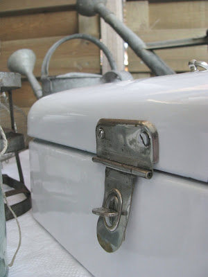 Jeg vet ikke hvor gammel denne brødboksen er, men kjempefin er den. (hundre ganger bedre enn den vennen kom hjem med, i Stål...iiiiiiiiik!!) Lite rust, og mesteparten av beslaget er i behold. Bare noen av skruene er byttet ut. Tror dere jeg er glad eller? Happy, happy!